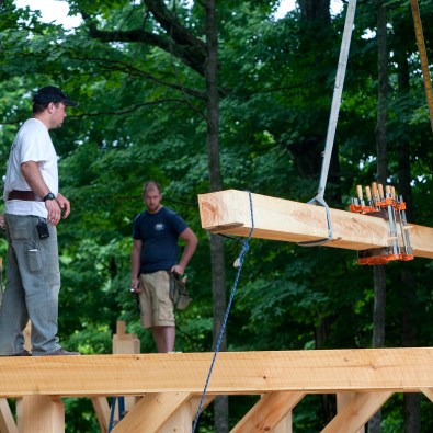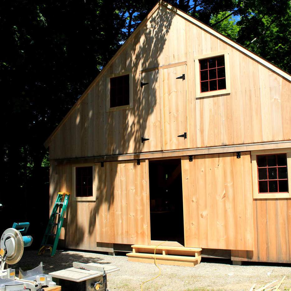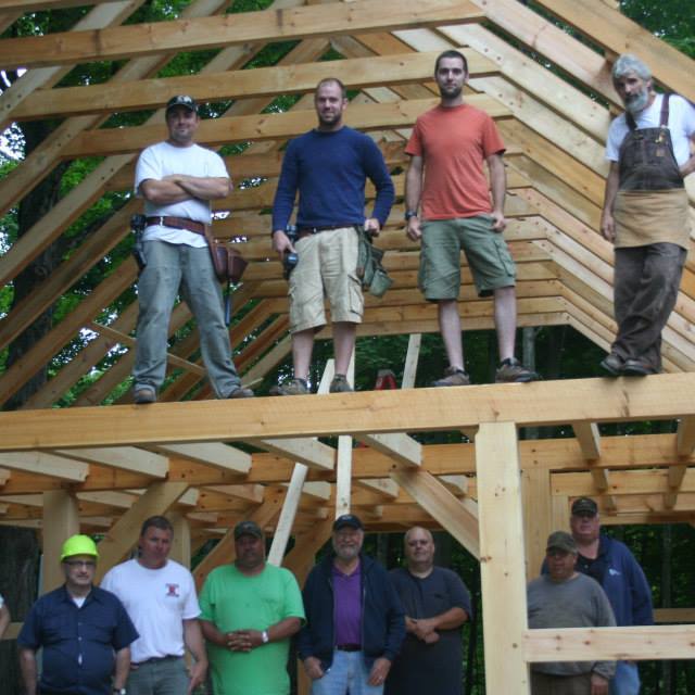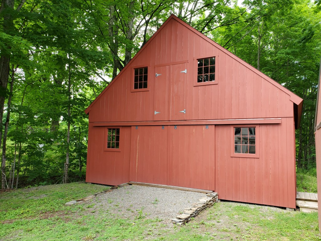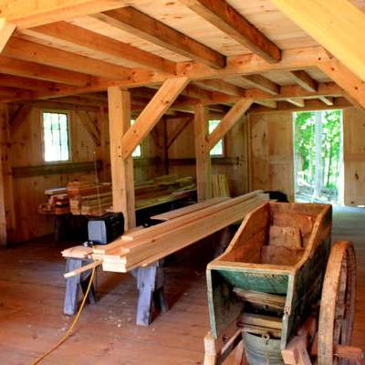 This two-story, timber-framed barn, 26 feet by 36 feet, was built by master timber framer Bud Menard of Jackson, Maine. The materials were provided through a generous $15,000 donation from the Davis Family Foundation. The framework is held securely together by mortise and tenon (no hardware). The frame was constructed in Bud’s shop, assembled on site at the museum (the Pilley House), and then raised by a crane and crew. The timber-framed barn is a masterpiece for the Brooks Historical Society Museum as well as an asset. It is as beautiful inside as outside with eight bays (four to each side) on the first floor, providing floor space for special displays of Brooks’ history. The second floor is spacious and useful for summertime activities such as presentations, workshops and meetings as well as exhibits. As a young man, Bud studied at the Northford Timber Framers School in Connecticut, and since then he has built many timber-framed barns.