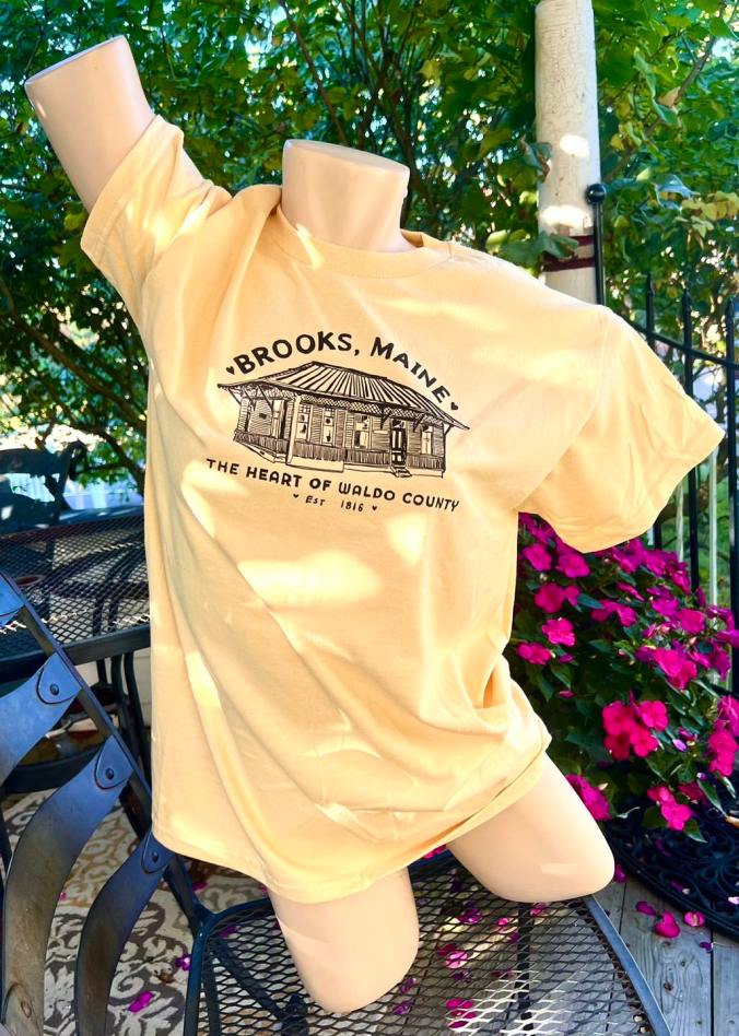 T-shirts are available at the Marsh River Co-op. Designed by resident and artist Addie Best, they come in pale yellow and light blue, sizes S-XL. $25. They depict the old rail station downtown. All proceeds benefit the Brooks Historical Society.